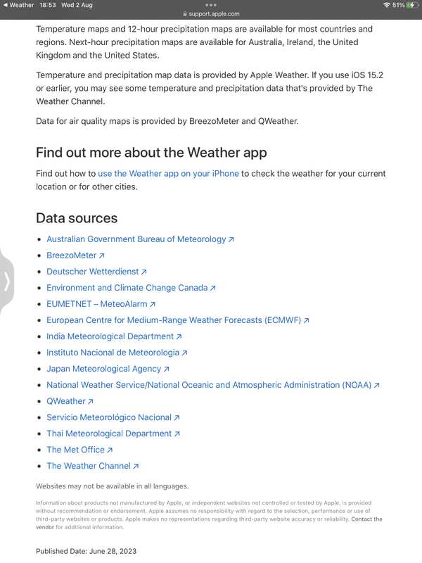 Use whatever has a precipitation radar function, then you can see where the rain is, and the direction it’s moving. I used WeatherPro for years; when I first got an iPhone I tried a number of weather apps, including the Met Office, which was rubbish, and WeatherPro, which proved pretty reliable, and when I subscribed I got hourly forecasts and those along with the rain radar, gave the best all-round forecasts. I had Dark Skies for a couple of years, along with WeatherPro, and once Apple bought Dark Skies I tried Apple’s Weather app, which is what I use most of the time now. The rain radar can be a bit glitchy at times, and slow to load tiles, but I prefer the way it shows areas of precipitation, it’s more graduated compared to WeatherPro, which is more pixelated. For the U.K., Apple’s data comes from the Met Office, and for Europe EUMETNET - MeteoAlarm and ECMWF - European Centre for Medium-Range Weather Forecasts.