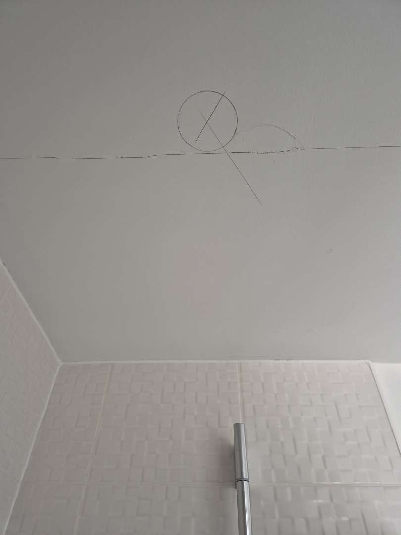 In order to get a downlight in the centre of our shower, it will need to be installed very close to a join in the plasterboard (handily shown by a hairline crack)