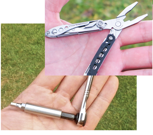 There are some multitools with an inbuilt bit-driver, and I’ve got a little flat reversible ratchet-driver, and a couple of sets of sockets and bits including screwdriver, Allen and Torx, which I always used to carry in a small pocket in my shorts, or in my hydration pack. Takes up very little space, and a small pair of pliers tucked in wouldn’t add much. I more often carried my Gerber MT900 multitool, just because it had cutters that would chop through a frayed end of a gear cable like cutting cotton.