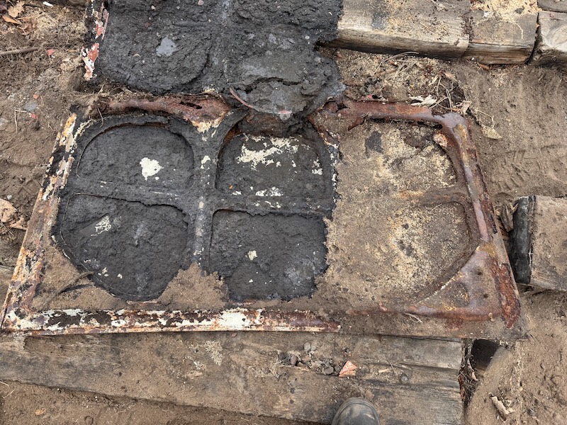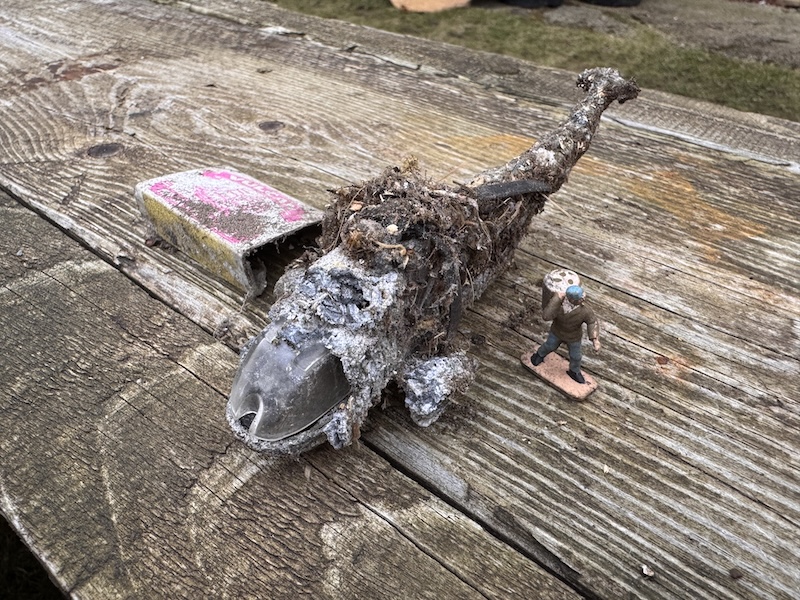 So down it came and off to the tip it went. However lurking under the shed, undisturbed for half a century it would seem - were the boot lid and windscreen of a car. (also a tiny bin man, a zombie helicopter and some sort of Gollum-like abomination approximate to a spider)
