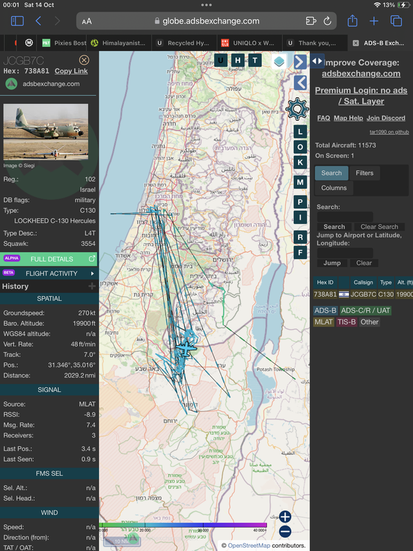 I was going to post this on the military aircraft activity thread, but it’s appropriate here. I was checking to see if any of our military are out there yet, as we’ve promised a couple of ships and P8 Poseidon surveillance aircraft are due to begin patrolling the area, and I noticed this Israeli C-130 had flown over 2000 nautical miles going back and forth, and wondered what it was up to. The Israeli air force don’t have Spectre gunships as far as I know, but perhaps it has sigint capabilities.