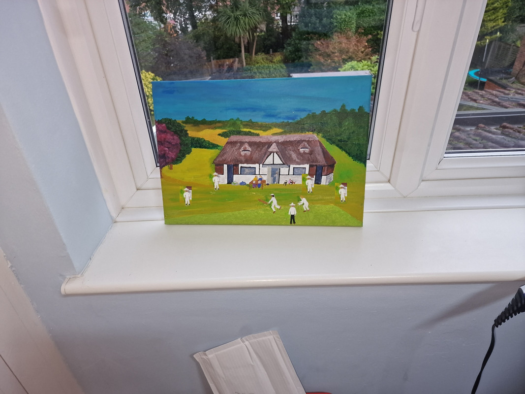 I have been asked to paint a scene of Lyndhurst cricket pavillion with some people playing cricket.