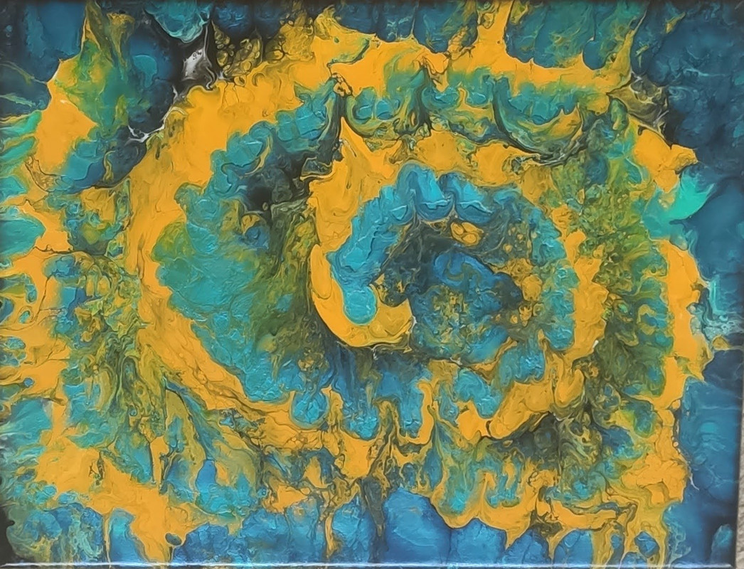 The paints are proper art acrylics mixed with Floetrol to extend them and a little water to dilute. The trouble with this one is I had completed the blue pour which worked well and then had some yellow left from previous piece and thought "If I just add a dash of that..."