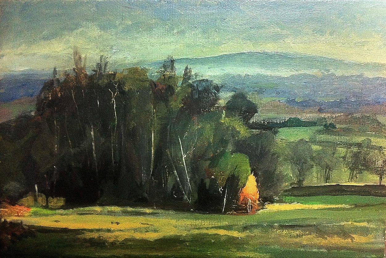 In the below sketch I used the same principles, as Bredon Hill in the background appeared to be half-enveloped on cold mist with the sun coming through, so it gets the cool blue fuzzy treatment, while the foreground is sharp and especially bright orange/yellow where the sun catches a small birch and bracken, whereas the similar autumn leaves depicted mid-distance are a simple cool, light umber giving way to purples (red/blue ie crossover from warm to cool)