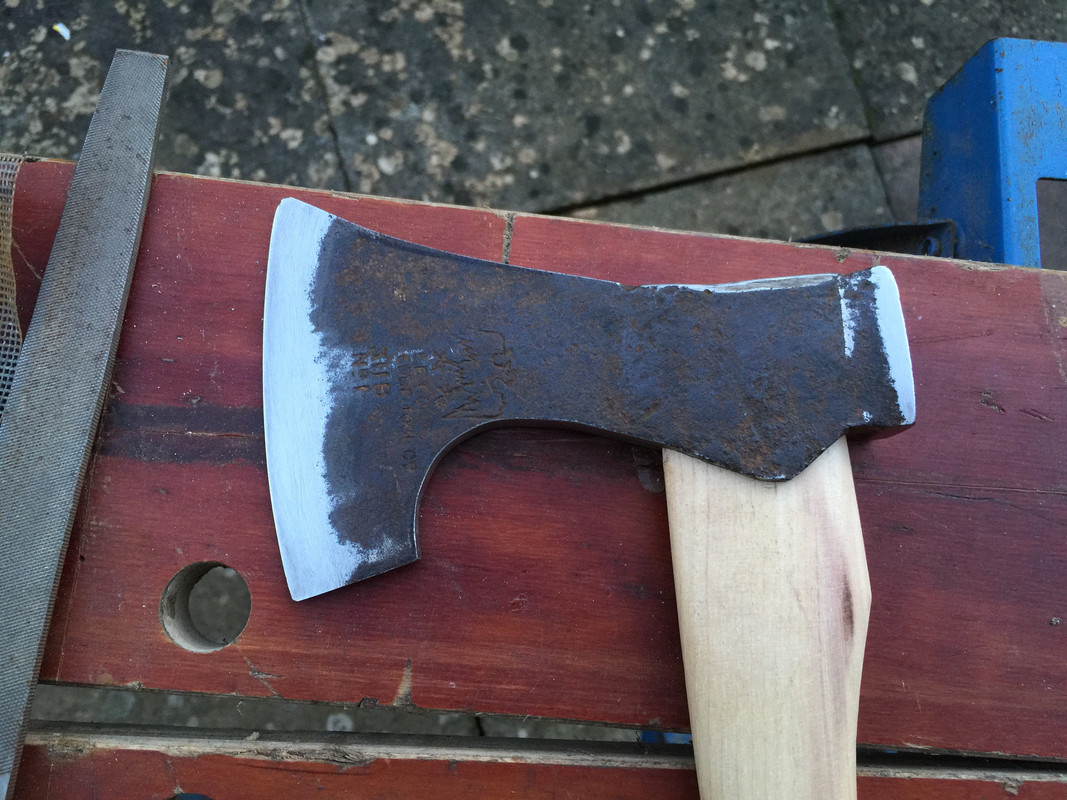 I modded a very blunt and rusty axe head I found in the shed a few years back, to use for carving, a Kent-style I believe. Bought a cheap disk-cutter that had no box, ex-demo, and went for it, just to see if I could make something usable.