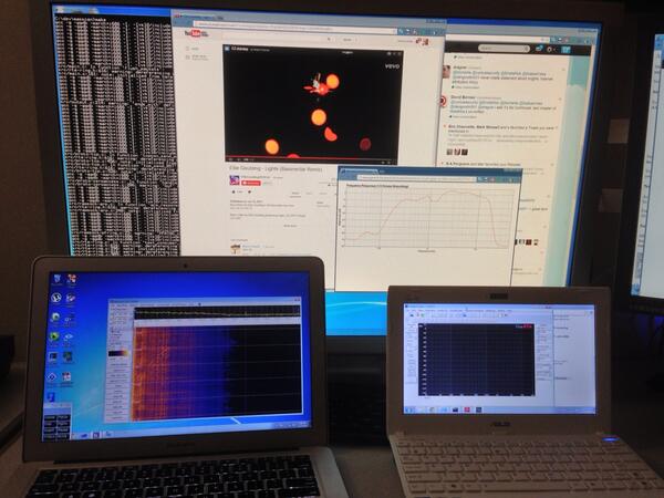 Left notebook receives 20khz carrier generated by notebook on right while dubstep plays background: