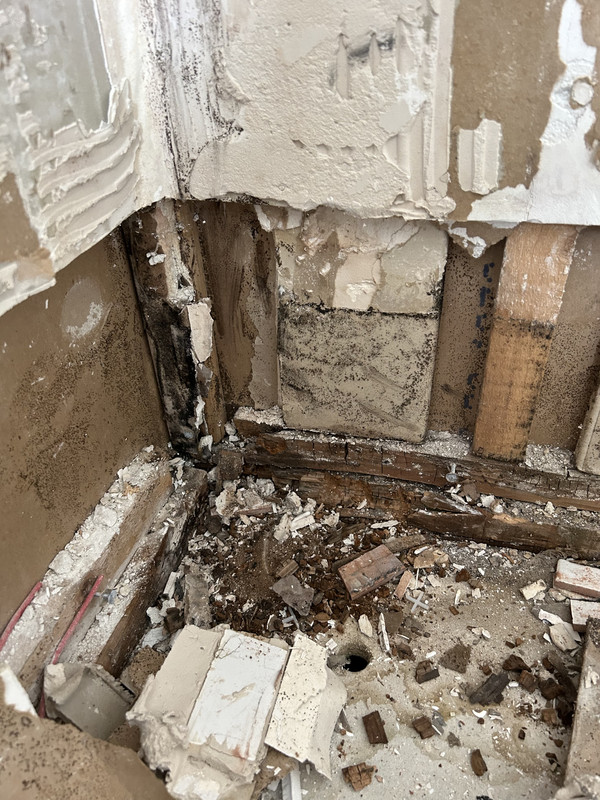 Room is fully tiled and approx 2m x 2m, just under in fact, so pretty small. I would expect all plasterboard to need replacing.