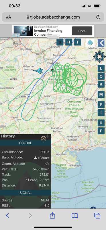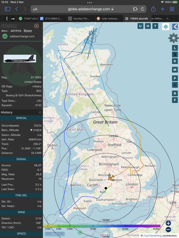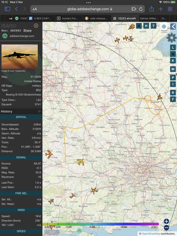 Having just zoomed back in to the area around Fairford, I’ve noticed the Buffs are heading back after drawing a cat’s-cradle all over Caithness, one has the callsign Fear32