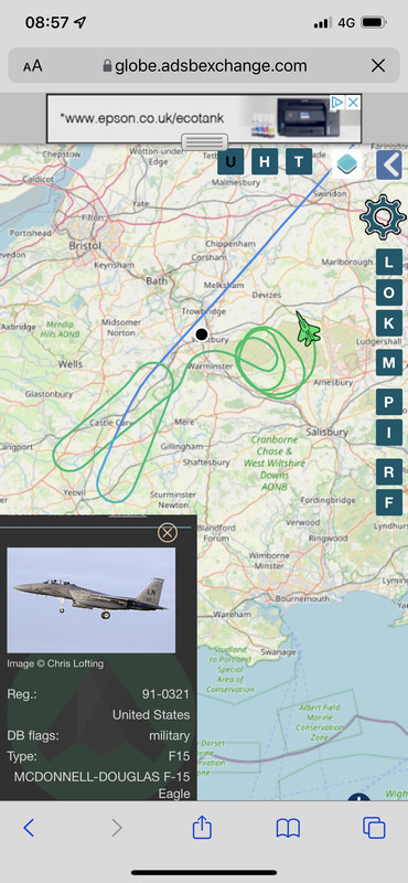 It’s not always easy to identify jets by their sound, but I can generally be fairly certain when an F-15 Eagle is around, they’re a deeper, more rumbling sort of sound, and last Friday I could hear one overhead, but it seemed to be circling, so I checked ADS-B to see what it was up to: