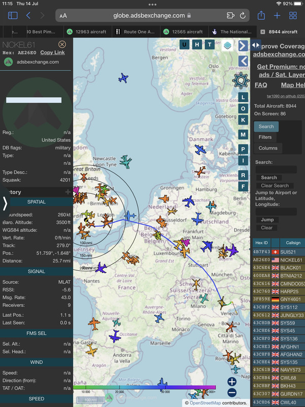 Something fairly fast and loud flew over yesterday, but by the time I got outside to see what it was it was too far away. Checked on ADS-B, and all it showed was it’s call-sign, NICKEL61, and nothing else. It seems to have originated somewhere in the Med, to the East of Italy.