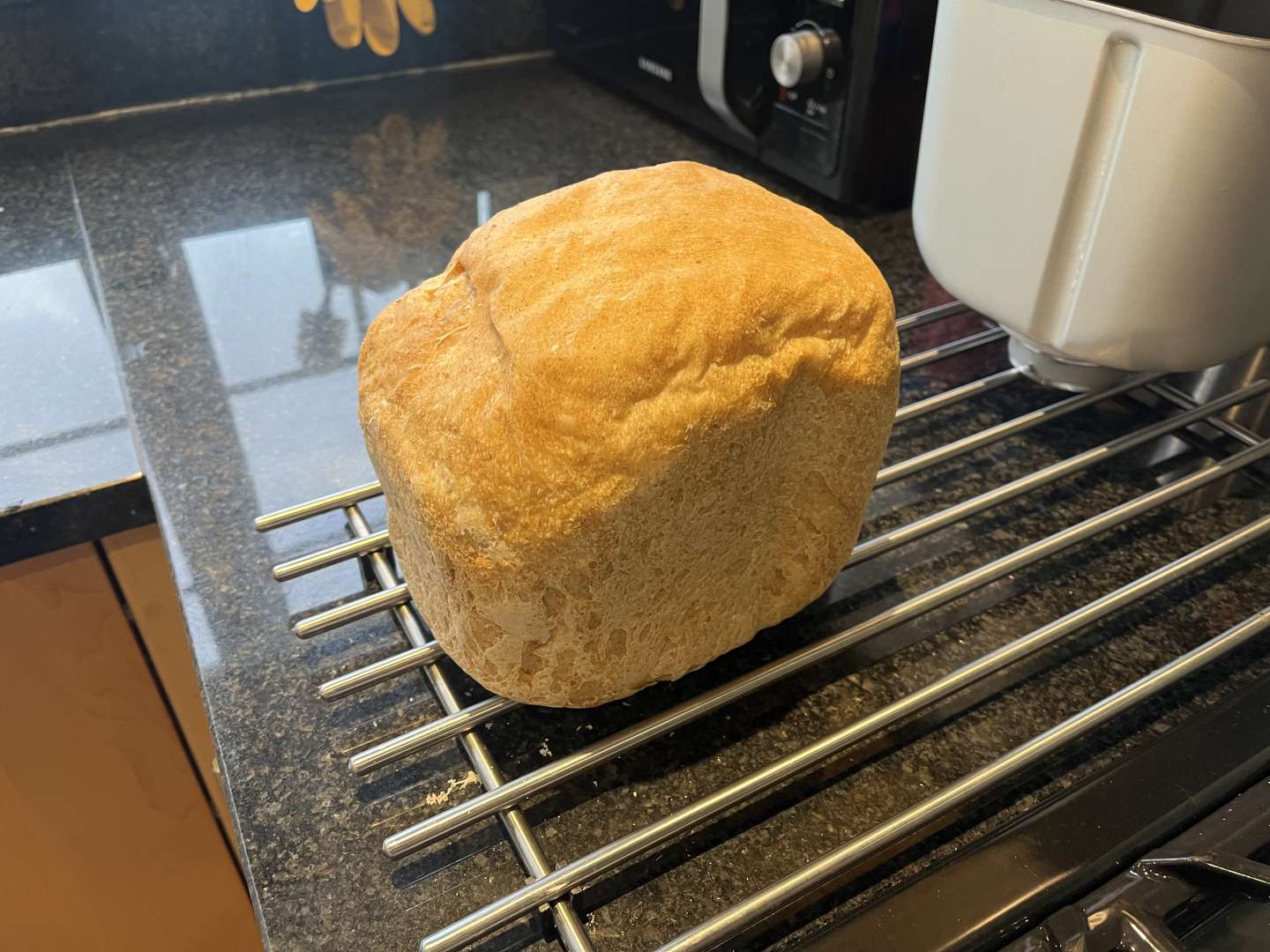Uh oh. The bread has risen all the way up to the window, and I only did a L mix! This is a going to be a bruiser of a loaf. Toast for breakfast and sandwiches for lunch I think. Either it developed gluten really well or it's got a massive hole in the middle.