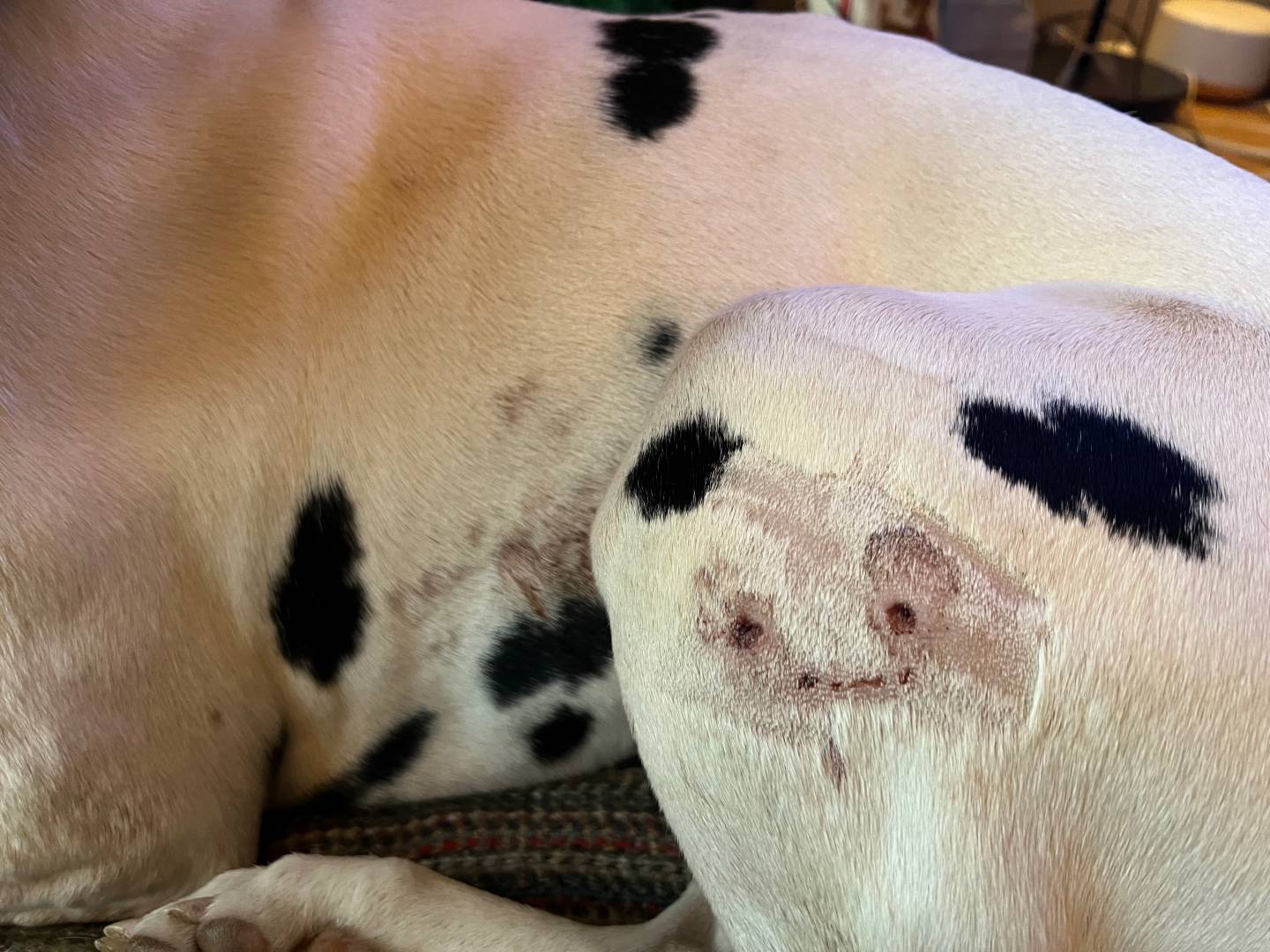 Bodie after a meeting with an off-lead total clown in December 2021. This was after the drain was removed, there are pics with lots of blood too. The right hand tooth mark is a through bite and cost the other owner £400 in vets fees (it was pay or have the dog reported & destroyed). Staffies can be lovely dogs but my personal experience is that walking them without concentration by the owner is bad form. (My daughter had one and whilst I could walk him off-lead under control, she couldn't guarantee that he was safe off-lead with her).