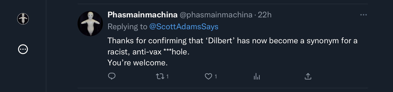 Just been flicking through my Dilbert book… still damn funny and portrays working in a 1990’s IT department perfectly. Adam’s went odd on social media about five years ago, proper “easiest to just unfollow and block this guy” stuff. Unsurprised at this recent event… but no idea whether he has been on a “journey” about how he feels toward his fellow citizens, or has just been pushing what he can openly say but has always thought, or whether he is playing with what can be said without believing in it himself. Only he can know for sure.