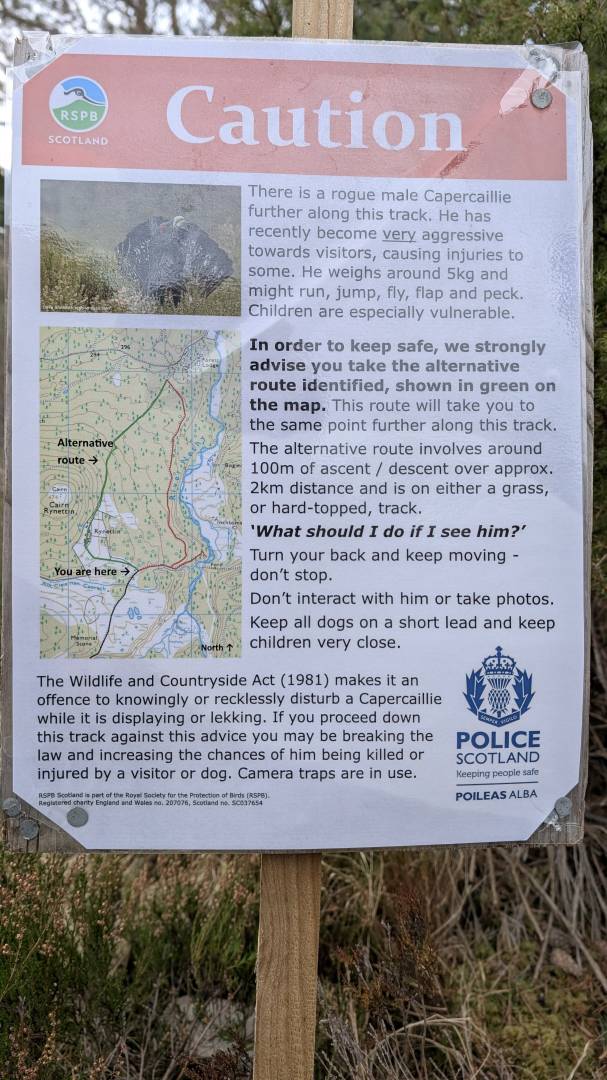 A rogue male capercaillie has been threatening and attacking passers-by on one of the major through-routes for walkers and cyclists. As a result there are new warning signs near Forest Lodge in Abernethy Forest.