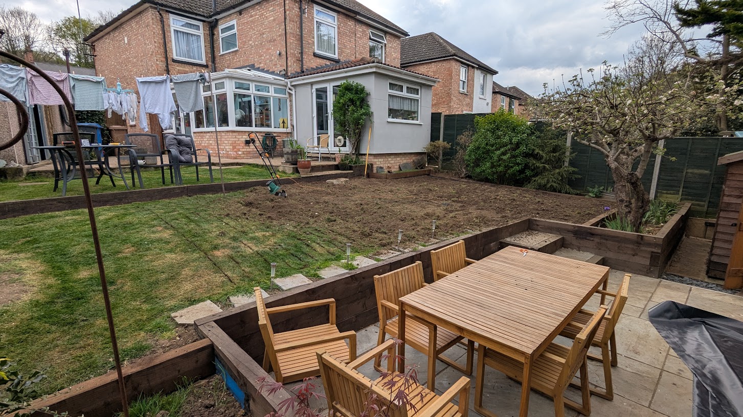 - Raked it all level (using a combination of rotavator, rake, scaffold board)