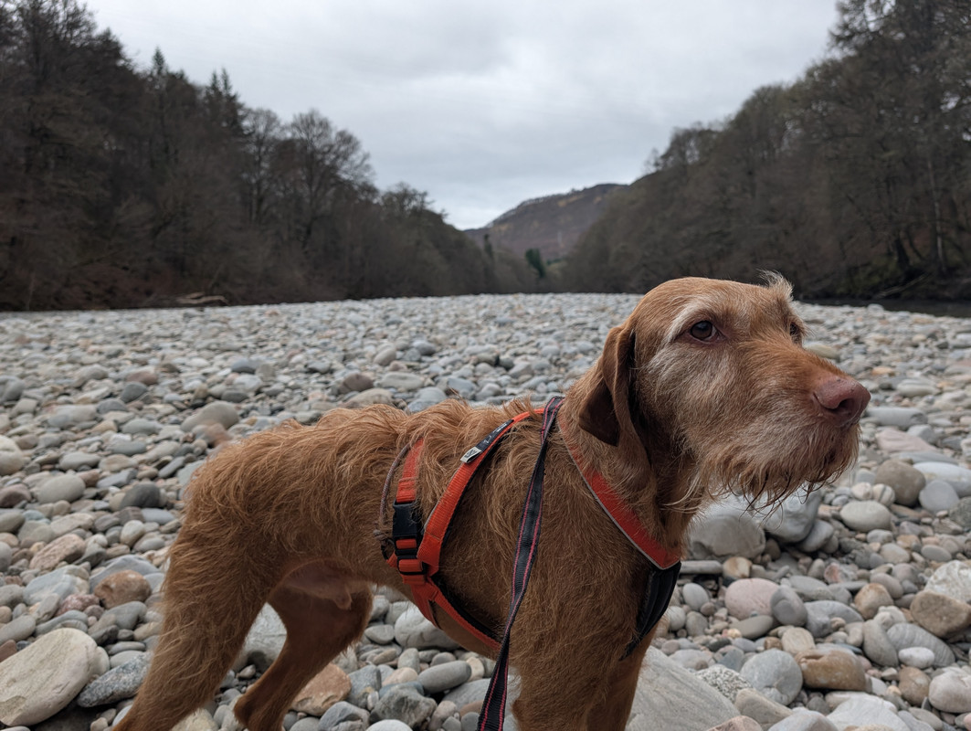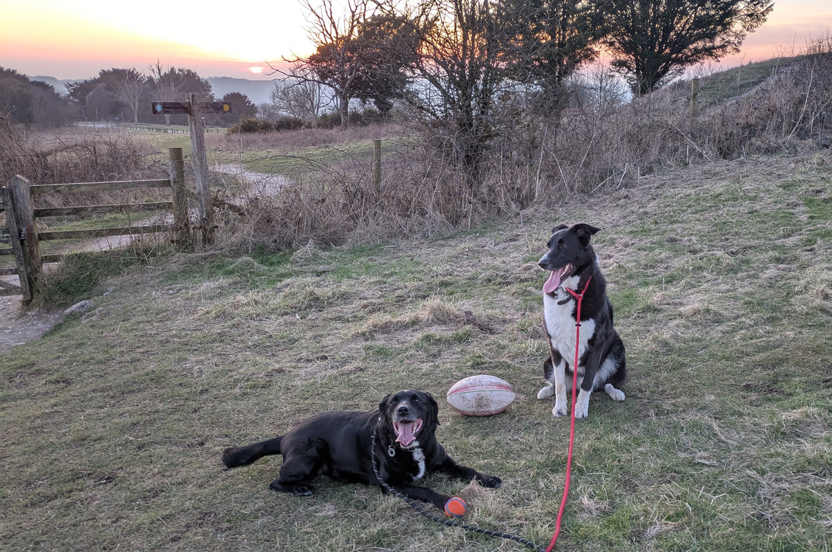 Huey, half way round a 6-miler earlier today. Needed some firm persuasion to sit for a photo, as there were pheasants & rabbits in the woods not very far away. Which probably explains the slightly distant look in his eyes.