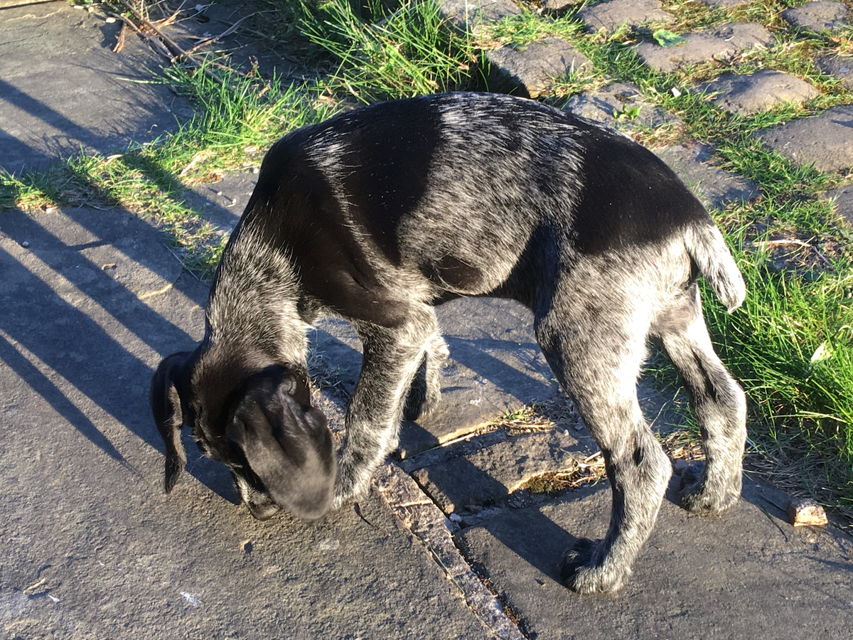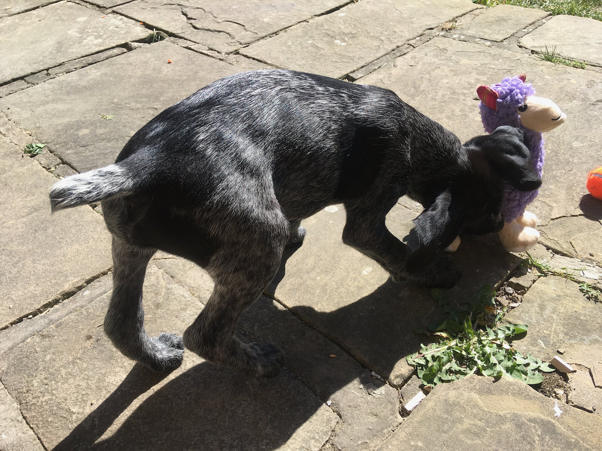 He likes toy llamas, rolling around on his back and having his tummy stroked, Jarlsberg, sleeping in his crate, carrots, which seem to be 'the best thing ever' and tripe, which is now known as Sprocket fuel. Fingers crossed, he will eventually make an ace, mildly shaggy, trail dog here in the High Peak 🙂