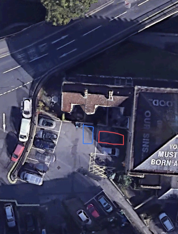 For clarity, this is the car park, the position of my mate’s Polo is marked red, the other car blue, and fortunately the space next to him was empty, otherwise we’d have been forced to hang around for God-knows how long for the jackass driver to turn up.