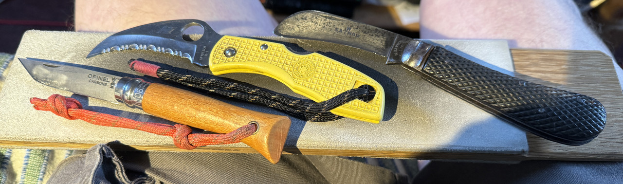 The modded Opinel I’ve never carried that often, having spent so much time getting the blade the shape I want it, I’m too afraid of losing it. The pruning knife on the right was my dad’s, and I don’t think there were many occasions when he didn’t have it in his pocket, but it’s rather bulky and it’s too precious to carry around, but I have used it in the garden occasionally.