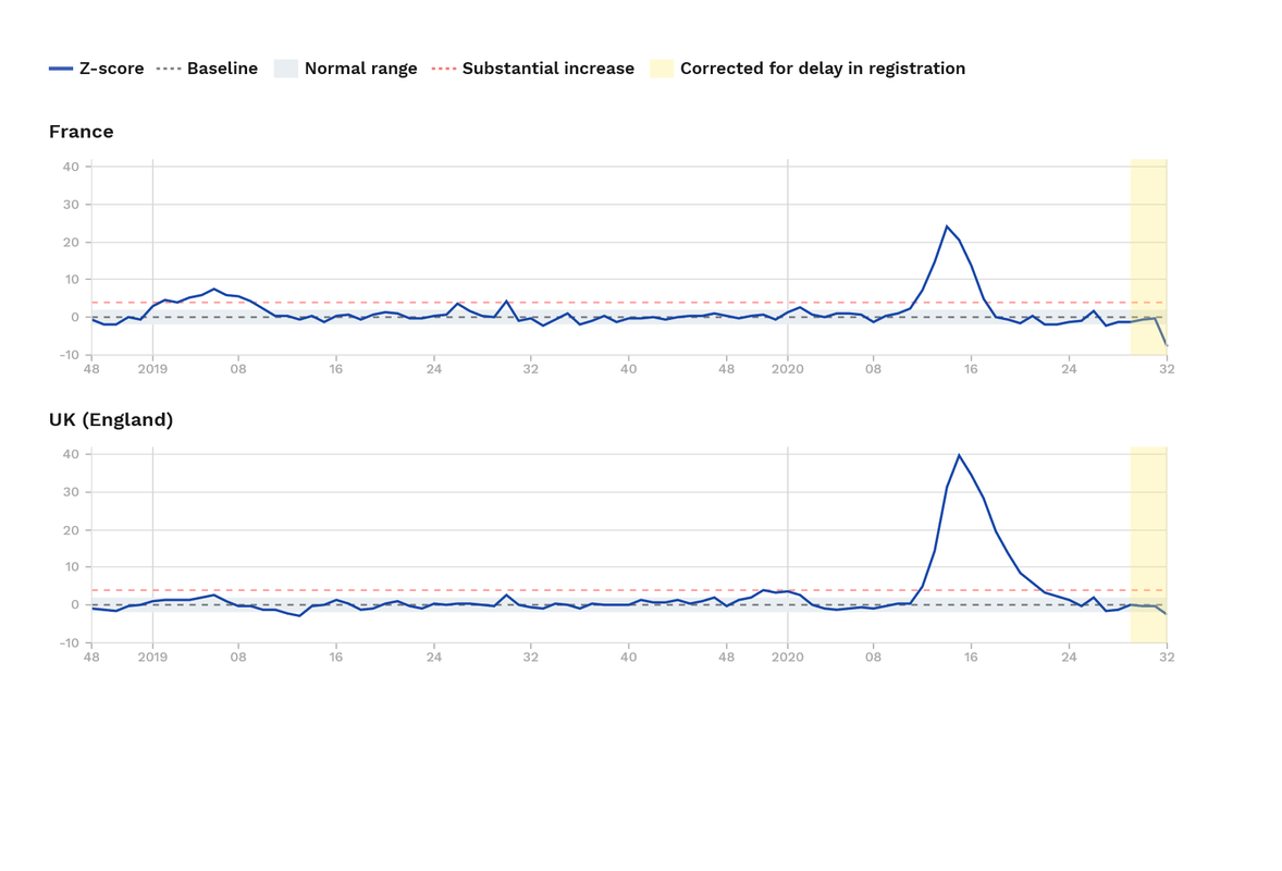 Whilst excess mortality in France is higher than normal, England is far ahead based on number of standard deviations from the mean.