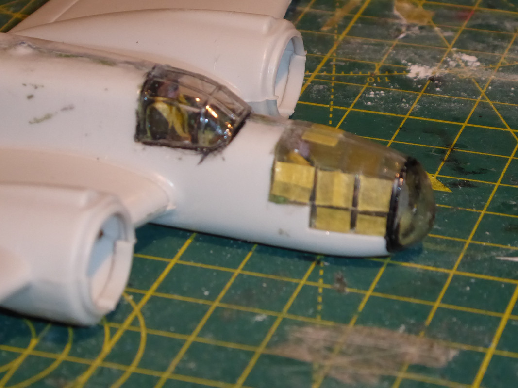 I managed to drop the box inside my chaotic under stairs cupboard and spilled the contents evenly between an open tool box, my "bike crap" bucket and the floor, resulting in the loss of the front section of nose glazing. After an amount of fruitless searching and industrial strength bad language I raided the spares box and butchered the front off a spare canopy from a Mitchell. It fits, but the shape is a bit off.