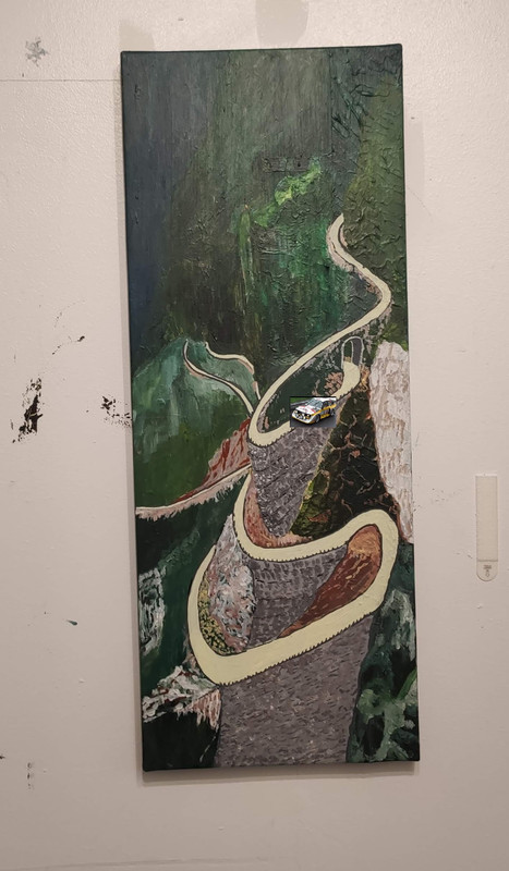 I am part way through painting the climb up Col Du Turini and the road are bugging me as they appear to slope off the edge. This is easy to fix by putting the road barriers up which will trick the eye into seeing them level but before I can add the barriers I need the traffic on the road behind.