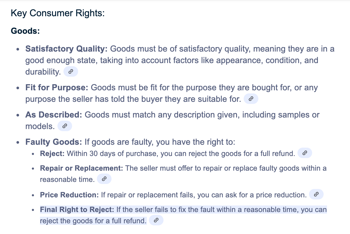 - If after at least one attempt at repair or replacement the goods are still faulty, the consumer has a “final right to reject”, meaning they are again entitled to ask for their money back. However in these circumstances the amount refunded can be reduced to take into account to amount of time the consumer has had the goods and the amount they have used them