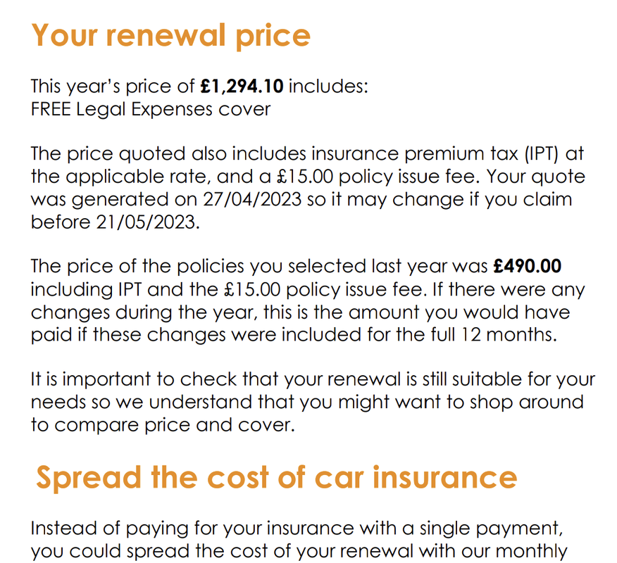 Partly but not completely I think that was something to do with a change in insurance tax &/or regs which you might have been the correct side of at renewal last year? Ended up with "flow" who were the best I could find but still about 25% higher than the previous year.