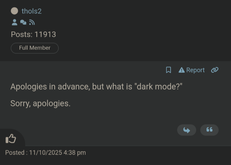 Last couple of days STW had flipped to dark mode for me. It's not the phone that is setting it, so I reckon it's stuck on here somehow. Where is the setting to turn it off? I've looked through my profile, it's not obvious.