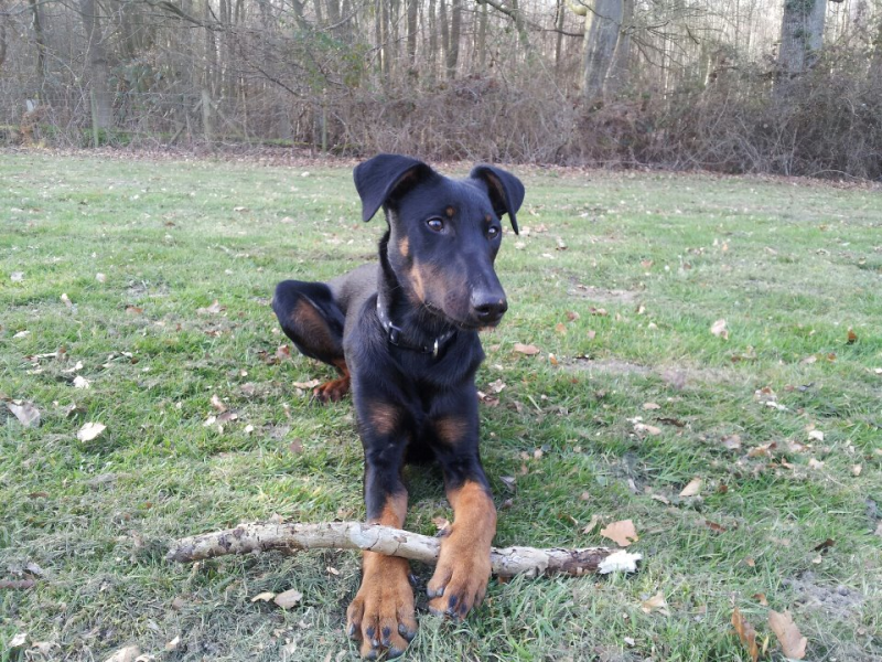 We have a 10 month old Doberman x Lab, he's 6 months in the picture below: