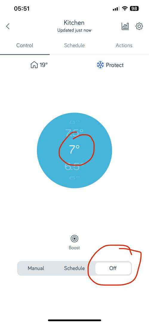 Hub wired into a wireless bridge in the bedroom (it was too crap to connect when the hub was downstairs and I moved the thermostat upstairs to where the old one was); receiver inside the boiler presumably, I have no way of knowing without taking it to bits; thermostat (google would suggest it's the "Mini" one, big silver knob and touch controls rather than buttons). I have no reason to suspect a connectivity issue. And yes, I have turned it all off and back on again. 😁
