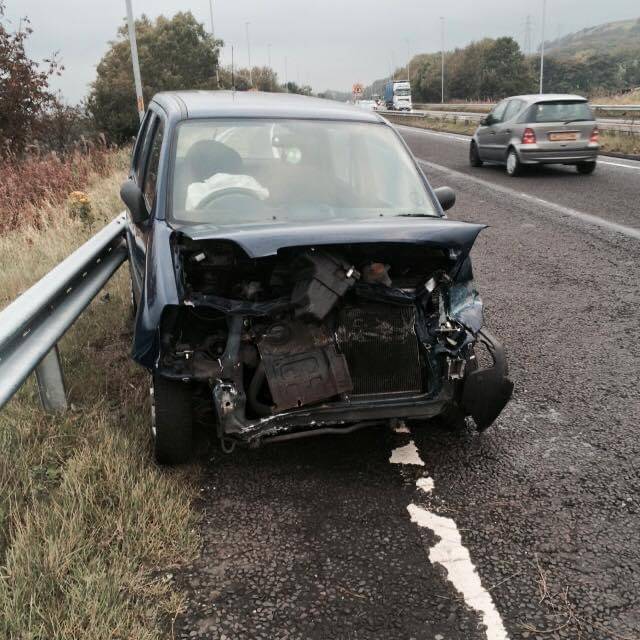 Just further up the road it bends round to the left, she was too busy on her phone to notice, drove straight into the central reservation then bounced, spinning, off the Armco on both sides of the road, unbelievably not hitting any other vehicles.