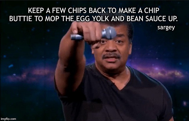 Keep a few chips back to make a chip buttie to mop the egg yolk and bean sauce up.