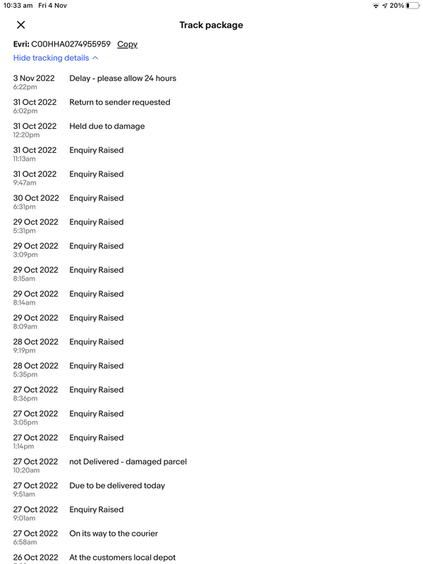 I'd had to wait a month for about a dozen parcels back in September, I'm now emailing customer services of online retailers to see who they use and actively avoiding placing orders with companies that use evri - locally at least there is just no point in bothering.