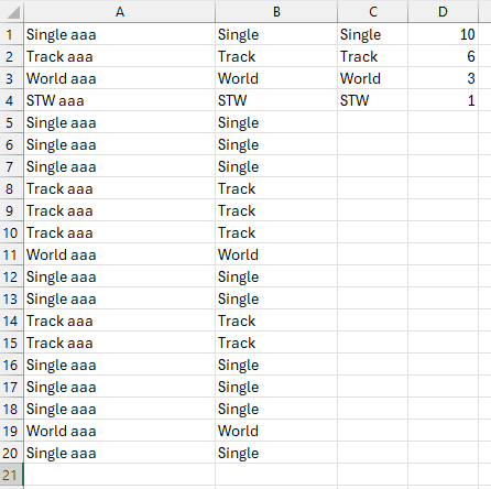 D: has this in D1, then dragged down to D4 to auto update the references =COUNTIF(B1:B20,C1)