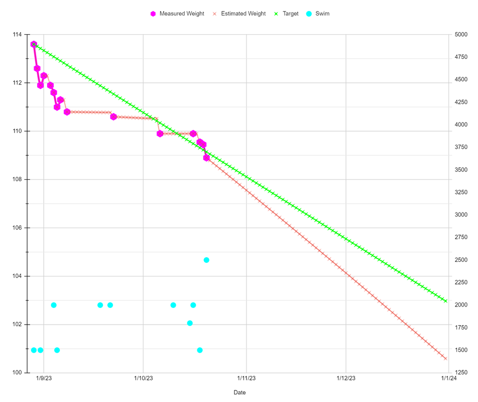 The pink dots are my actual weight in Kg - axis on the left. The blue dots are distance swum in metres - axis on the right.