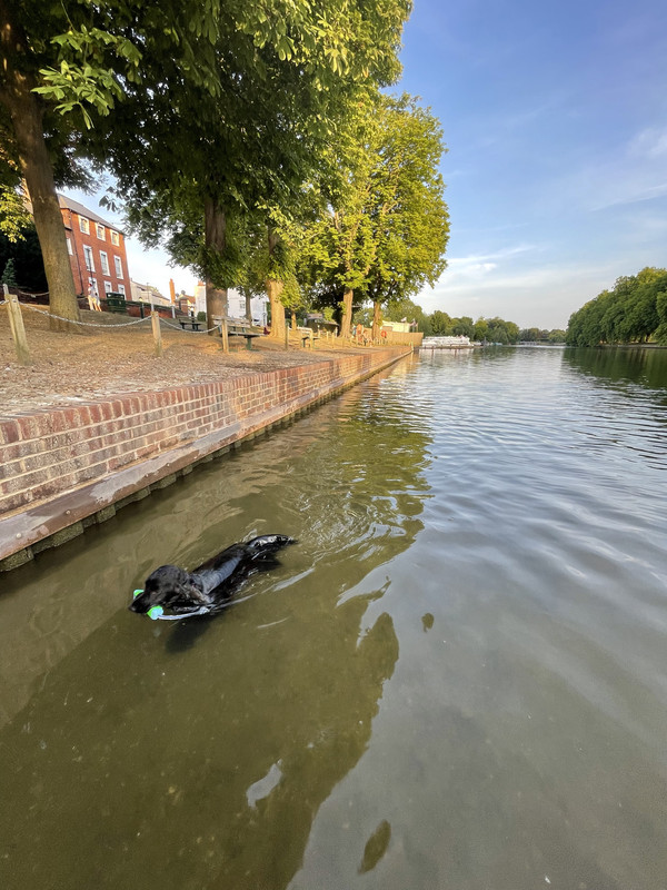 Swim in the Thames with the dog this evening. Will be the same tomorrow to cool down. Loft office may peak at or about 40 so I may have to decamp to the cooler North facing dining room. We have a sun awning and it keeps the back of the house noticeably cooler. Blinds at the front (south) have been closed all day. Dog chilling earlier.