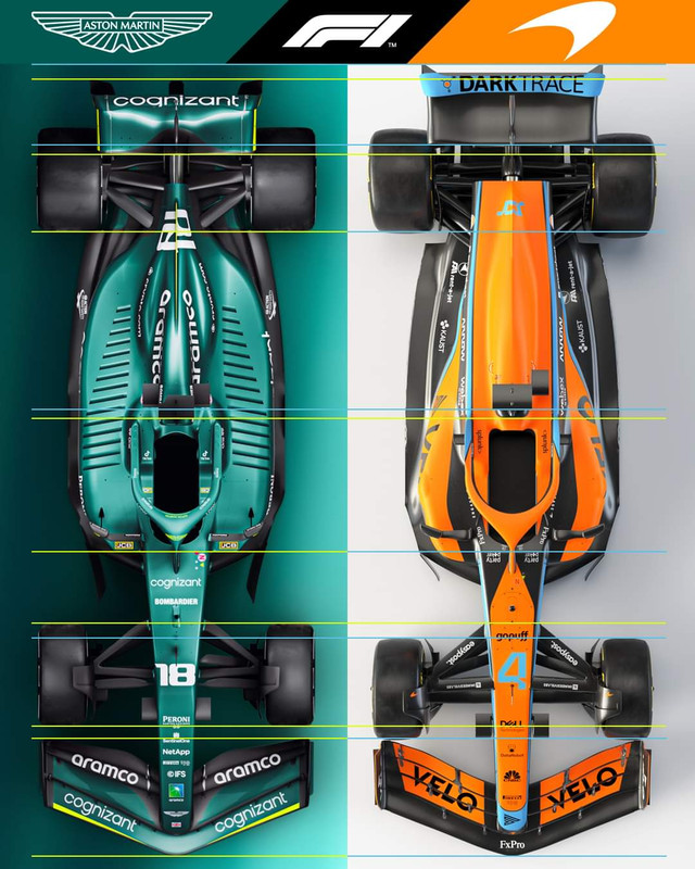 AM, McL and AT all have significantly different sidepod concepts, and AT having a long nose, while the other two a short nose and "hanging" main plane of the front wing. It also looks to me like the AM has a more pronounced anhedral shape to the front wing, that may get more/cleaner air to the centre of teh floor/venturi's...