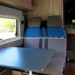 It's got two single seats at the front on swivels, I bought a Ducato single seat off Ebay. And then two belted seats in the back on a raised floor. Shower room, toilet, two burner stove and fridge.