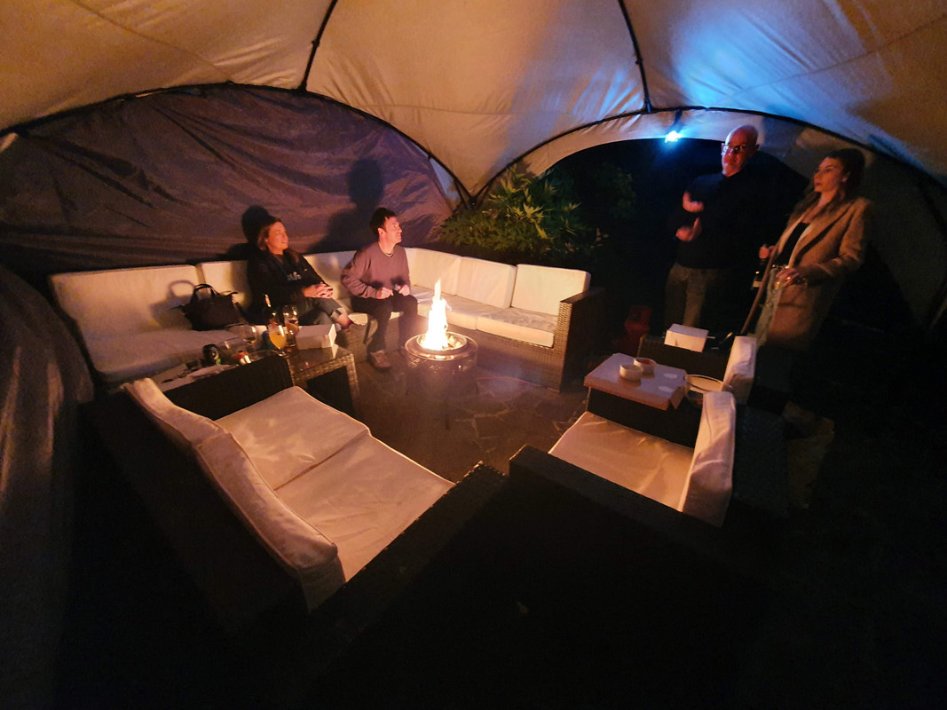 Not the best picture, but we just put up an event shelter (with side panels) over the outdoor seating and have a gas fired washing machine inner fire pit. Works a treat - no sparks to worry about with the gas one, but I've also used an open fire pit in there with no issues either