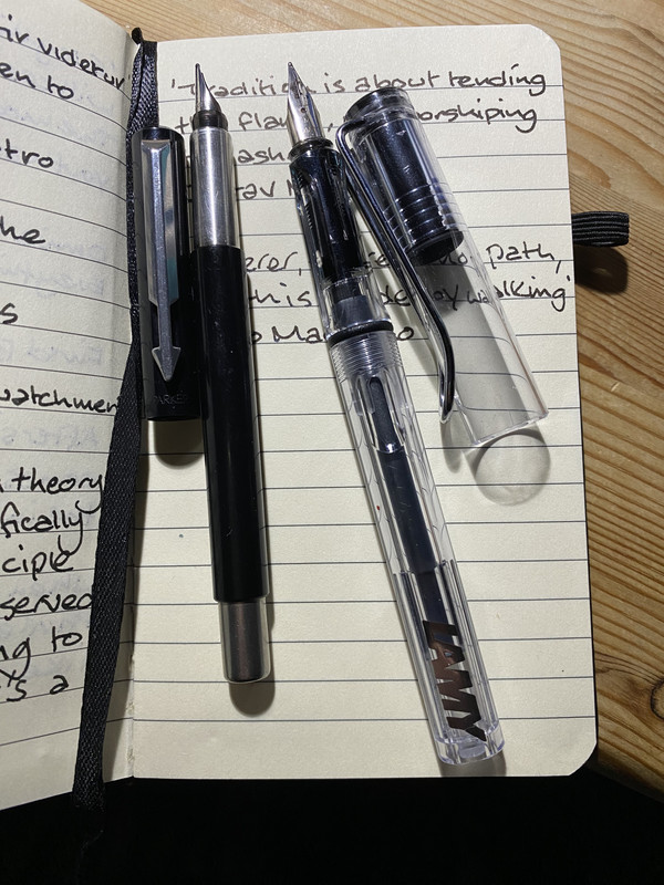 Has it been that long since I looked at this thread? Actually hadn’t really thought about it, although I did buy a new pen a little while back, a clear Lamy, saw it in WHSmith, and realised that I had a black one from way back that I’ve mislaid, so bought it, and realised it’s actually a really nice thing to write with. I’ve got it with a little notebook that I write quotes and sayings in. I also came across a Parker that I bought many years ago, 70’s perhaps? Dunno, had it a long time, it was very dried up, so I soaked it in warm water to clean out all the dried ink and got some fresh cartridges and realised just how smooth it writes, just a really nice writing instrument, and not an expensive one by any means. Really glad I found it.
