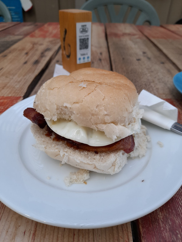 This was my midmorning snack, crispy bacon, perfectly fried egg, smothering of brown sauce.