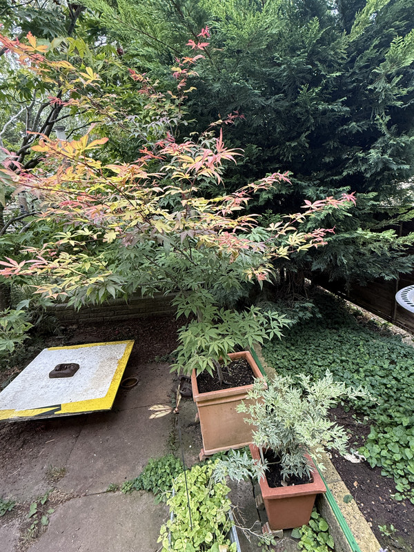 The small, pale green variegated Acer dicectum is one I bought recently to replace a seedling that’s struggled for several years, but never managed to grow decent roots, and sadly withered and died.
