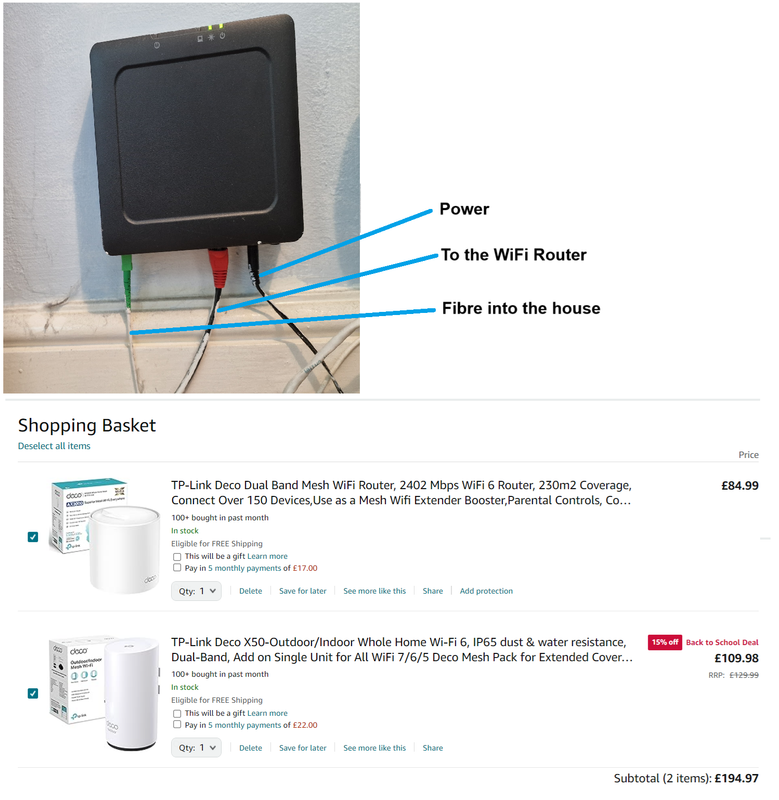 Quick question: 1959 built solid brick house, Extended a couple of times. Virgin FTTC comes in at the downstairs front extension at 274Mbps. Virgin Hub3 router. Using a TP Archer which means 2 separate wifi addresses and patchy coverage. Just moved into a bedroom at the back extension upstairs.