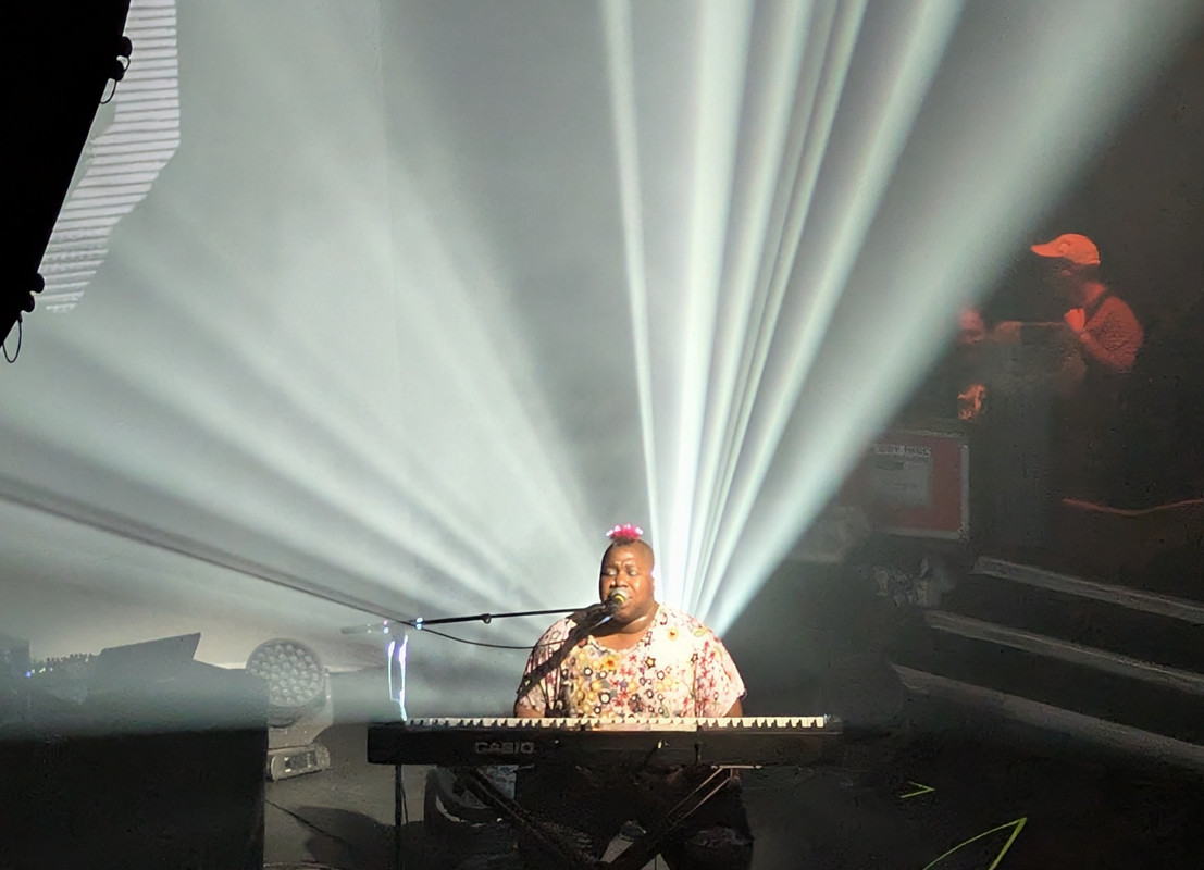 Clipping. last night at Koko in London was amazing! My mate was in the accessibility area, basically a balcony (koko is an old theatre) overlooking the stage right in line with the PA..so the sound up there was monstrous! So I stayed up there rather than squeezing on to the totally packed dance floor like I normally would! Had the freedom to fling myself about like a loon without the usual phones in the face or some hippy's hair in my mouth... Loved it! Even took a photo during a quiet moment, cos I thought this looked cool..she was doing gospelly vocals and live piano which added a nice touch.. Best band evah!