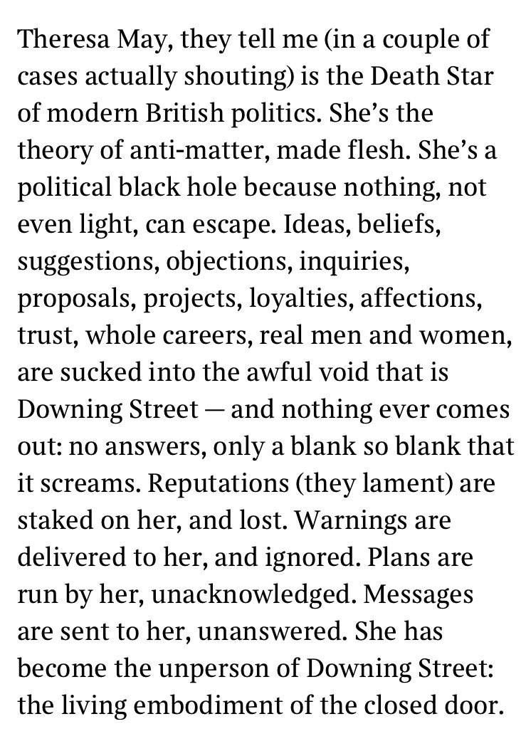 A bad Home Secretary and a terrible PM, she chose the conditions of failure early on with her red lines and "winner takes all" approach to the referendum result. From then on the narrative was all "traitors" and "saboteurs" and now we're here with an unprecedented lineup of the venal and the incompetent vying for the job.