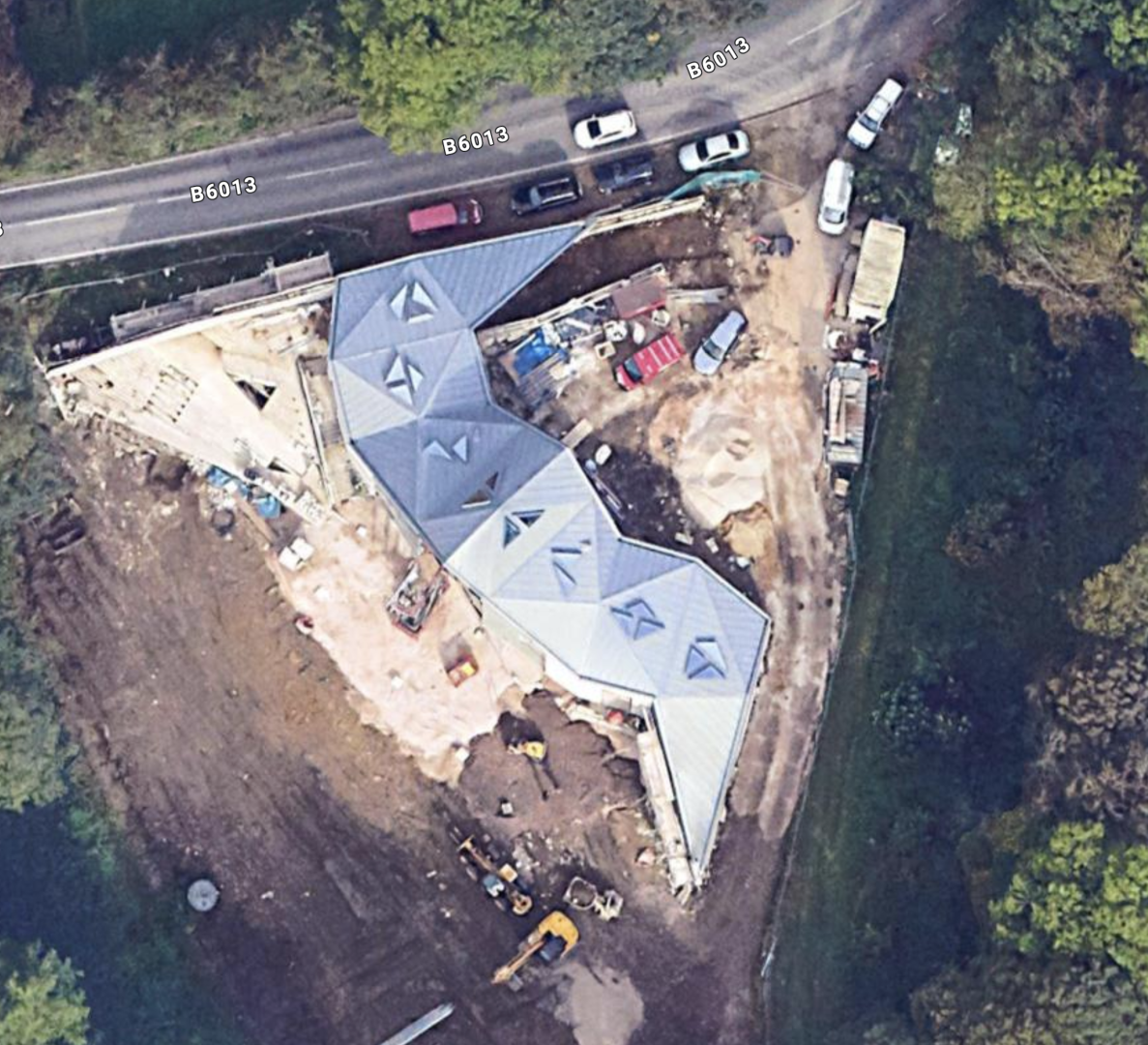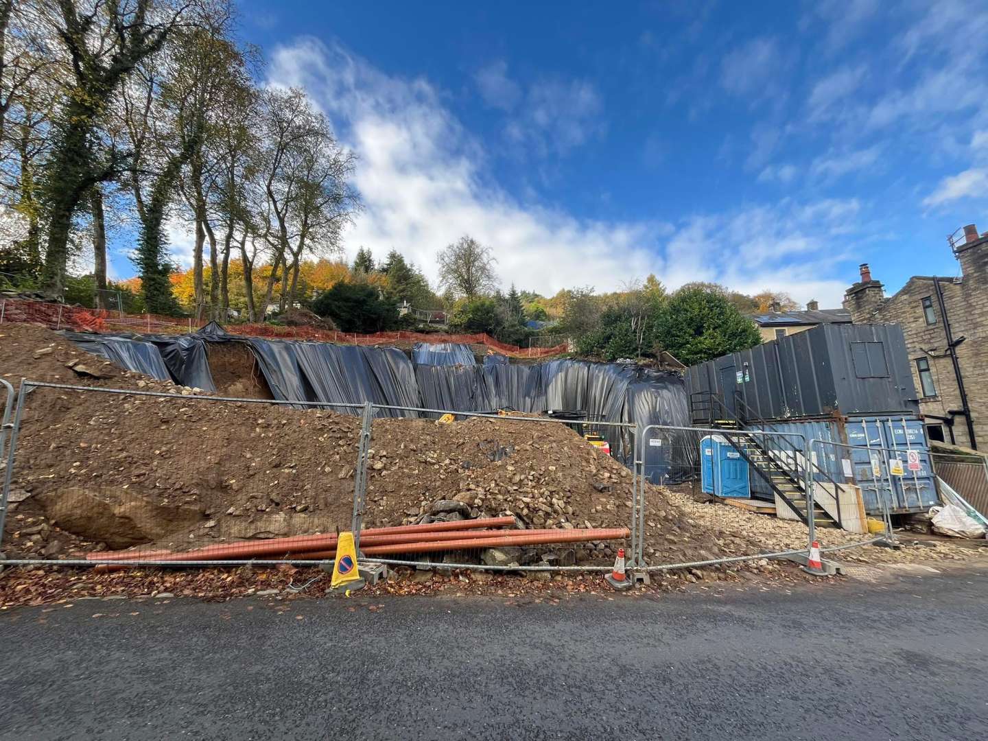 They've just been slapped with an order to pack in working on it by the local planning office and United Utilities as their excavations are causing havoc with the drainage and underground pipework around the site as the hillside is sliding down in an attempt to fill the big hole they've dug. As there are houses all around it - perfectly normal stone terraces - it seems a very odd choice of site. God knows how they got planning permission for it.