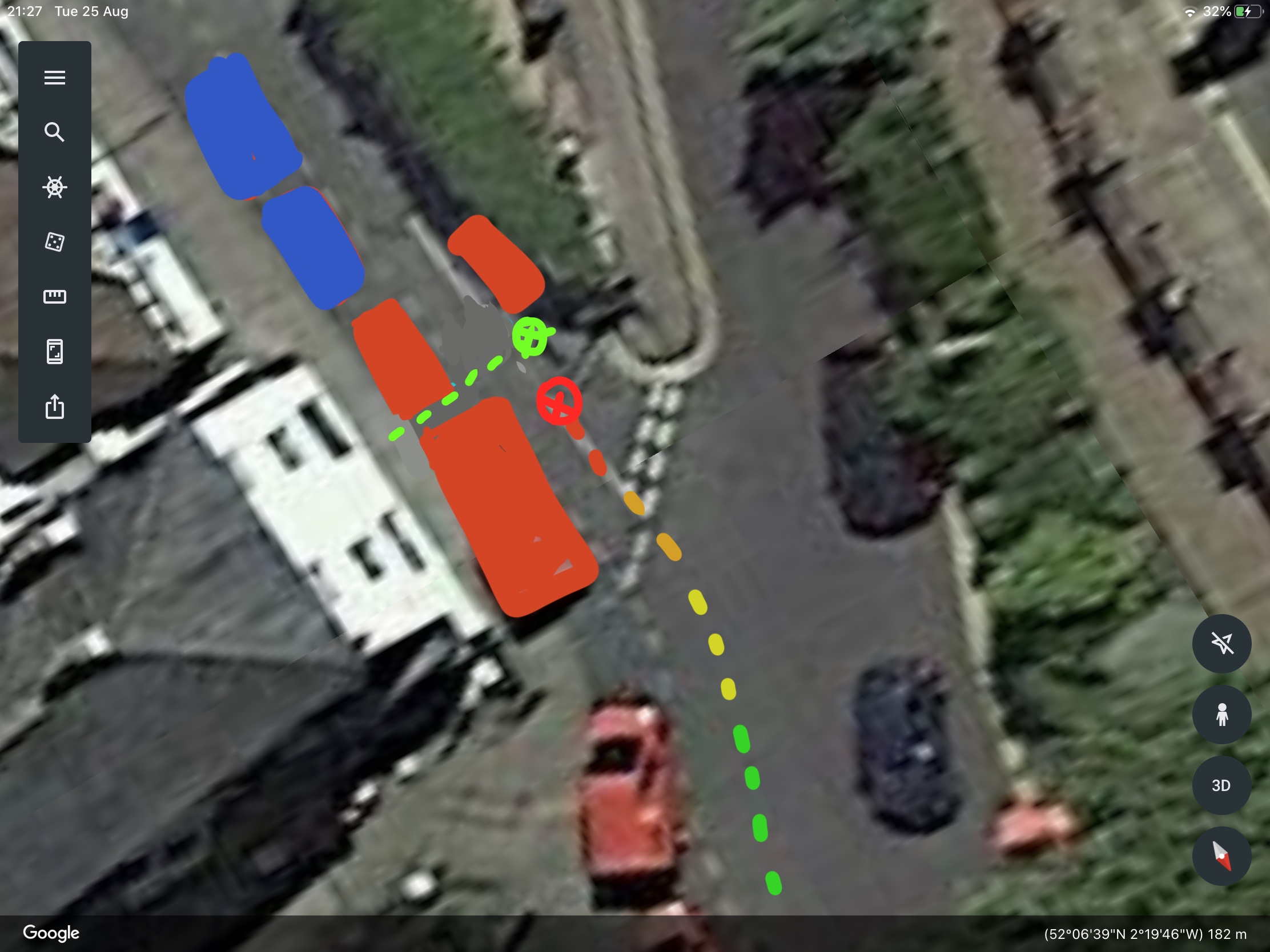 Me - green (5 mph green slowing to walking pace (orange/red) to stop (red circle)