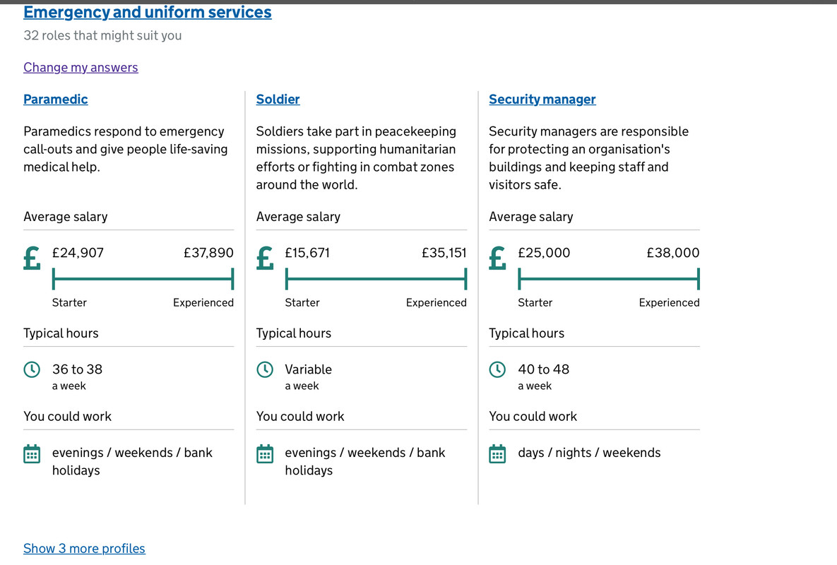 Returned the best part of 25 different career possibilities for me, many of which would require 5yrs+ of training (conveniently at huge expense to the individual into the goverments pocket!) before I was even able to earn a penny practicing said profession...