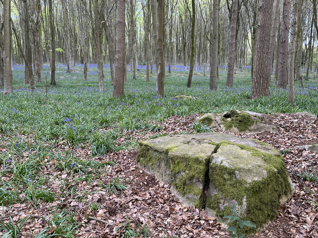 Riding south from Swindon will bring you towards West Woods, west of Marlborough and close to Avebury, Silbury Hill and the Wansdyke, which runs through it, and which is the source of the Sarcen Stones that are the main feature in Stonehenge - there’s one in this photo, along with bluebells:
